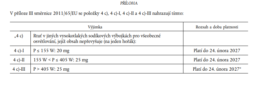 Pro některé vysokotlaké sodíkové výbojky s nižším obsahem rtuti platí výjimka, která byla v roce 2022 prodloužena o 5 let do 24. 2. 2027. Datum platnosti výjimky je jasně stanoveno a z dokumentu nevyplývá, že je výjimka platná, dokud bude zrušena. Po tomto datu by se uvádění HPS na trh mělo zakázat, pokud nebude udělena výjimka nová. Směrnice 2022/275 je technickým prováděcím předpisem, který zpřísňuje pravidla nastavená v RoHS s cílem postupně vytlačit rtuťové světelné zdroje z trhu EU. V Příloze III. se zabývá vysokotlakými sodíkovými výbojkami (HPS) pro obecné osvětlovací účely. Nařízení Komise (EU) 2024/1849 (revidované nařízení o rtuti): Toto nařízení zavádí zákaz výroby a vývozu některých rtuťových světelných zdrojů, včetně určitých vysokotlakých sodíkových výbojek s obsahem rtuti nad výjimkou povolený limit, s platností od konce roku 2025.